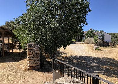 Von der Straße gelangt man durch ein funkgesteuertes Tor in die Finca, wo man sein Fahrzeug unter einem Schattendach abstellen kann. Von dort sind es 40 m bis vor das Haus, vor das man auch unmittelbar zufahren kann, wenn man zB. Einkäufe auszuladen hat.